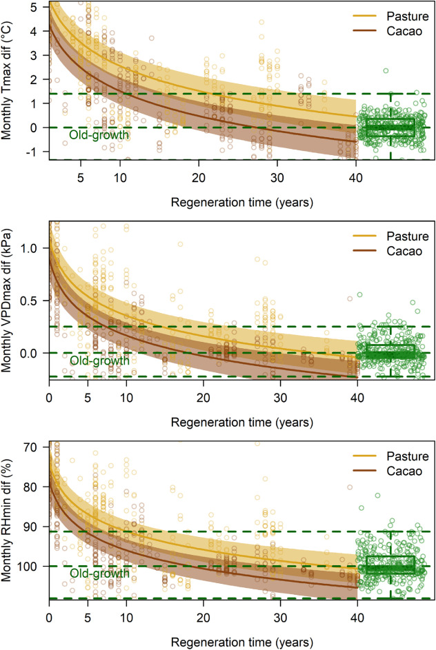 The new paper, published in Agricultural and Forest Meteorology, showed that, during hot and dry days, intact forests were up to 6.2°C cooler than pastures or young, open secondary forests. The microclimate buffer on Tmax of recovering forests was re-established after 30–40 years for secondary forests growing on previous cacao plantations (where cacao trees provided a small 1.2 °C cooling effect), but it took longer (50–80 years) for forests growing on open pastures. Relative humidity and vapour pressure deficit, which are also highly relevant for organisms, recovered a decade earlier than Tmax. Cloud cover was found to have a strong influence on the cooling effect. Since climate change not only increases hot and dry extremes but also reduces cloud cover in the study area, this becomes a very relevant issue. Our Research Unit will thus investigate such microclimate effects in more detail in future, guided by Felicity Newell, who is a Mercator Fellow for Reassembly. She has just begun a professorship at Texas A&M University.