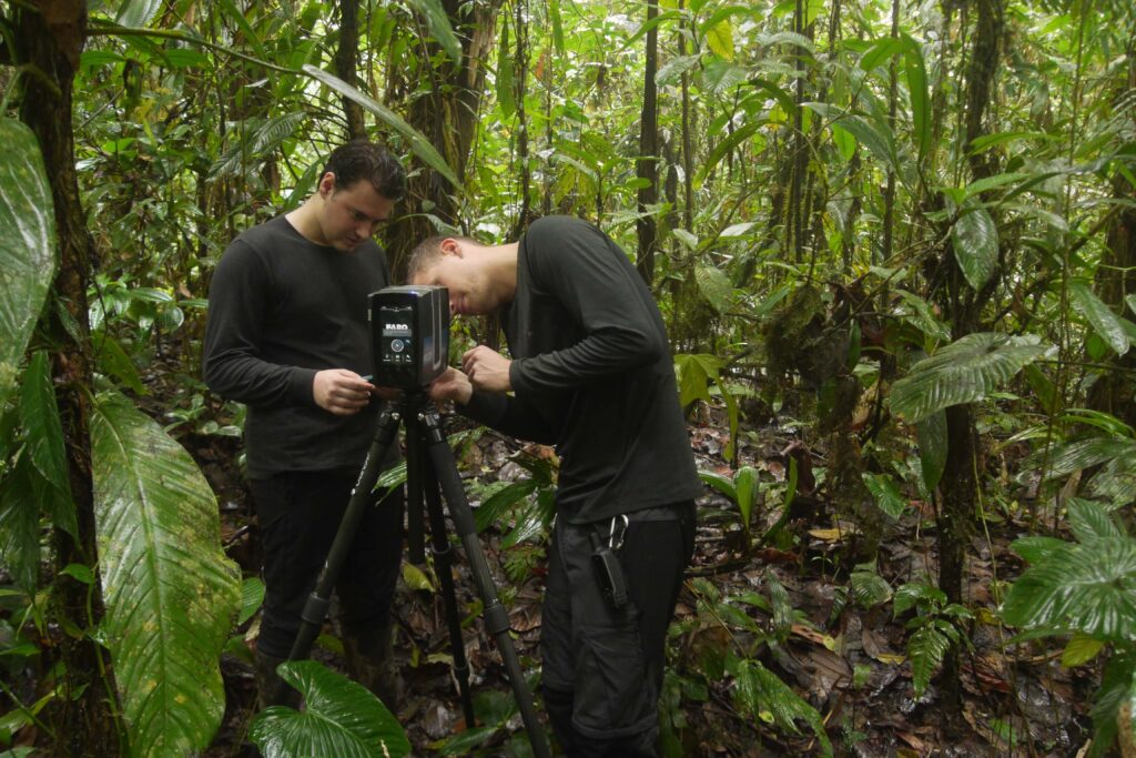 Foto: Tim (right) setting up the terrestrial laser scanner in the understory of one of the old-growth plots.