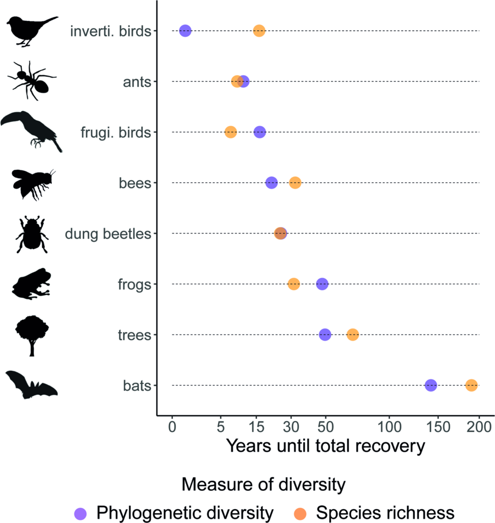 Our first synthesis on phylogenetics was published! In the words of the first author “in this study on the recovery of phylogenetic diversity and phylogenetic community structure, we found that early regenerating habitats do not necessarily harbour closely related species that are later replaced by distantly related ones during late regeneration, as is often expected. Instead, we found that no single assembly rule is followed by all taxa, as different groups respond differently to post-disturbance succession. We also found that phylogenetic diversity can recover relatively rapidly within 50 years for most groups, suggesting that the studied communities are resilient to disturbance from an evolutionary perspective”